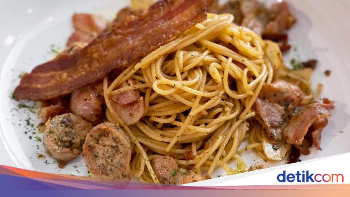 Jika ada stok daging olahan kamu bisa meracik spaghetti yang pedas gurih ini. Spaghetti mulur enak dimasak dengan sosis dan diberi topping beef bacon renyah.
